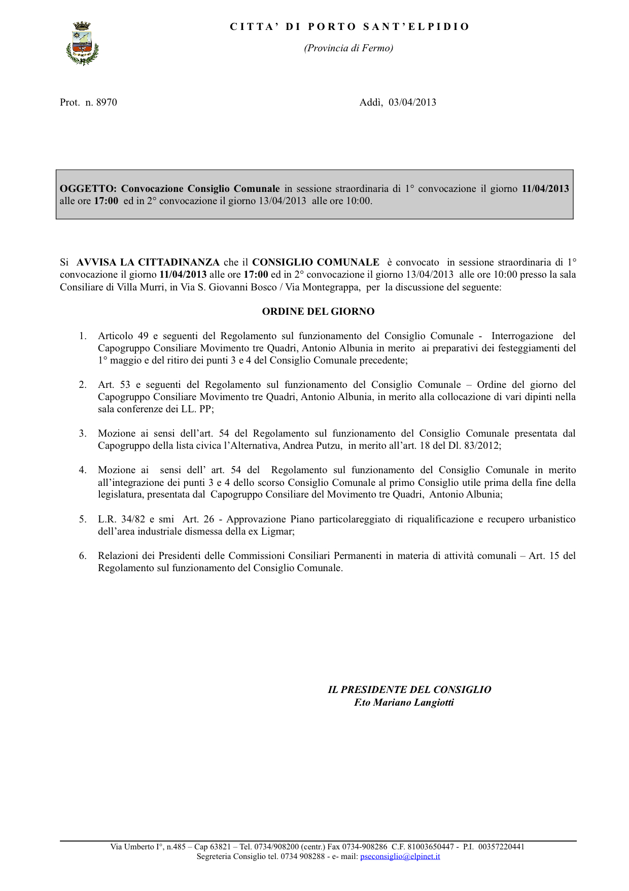 Giovedì 11 Aprile convocazione del consiglio comunale