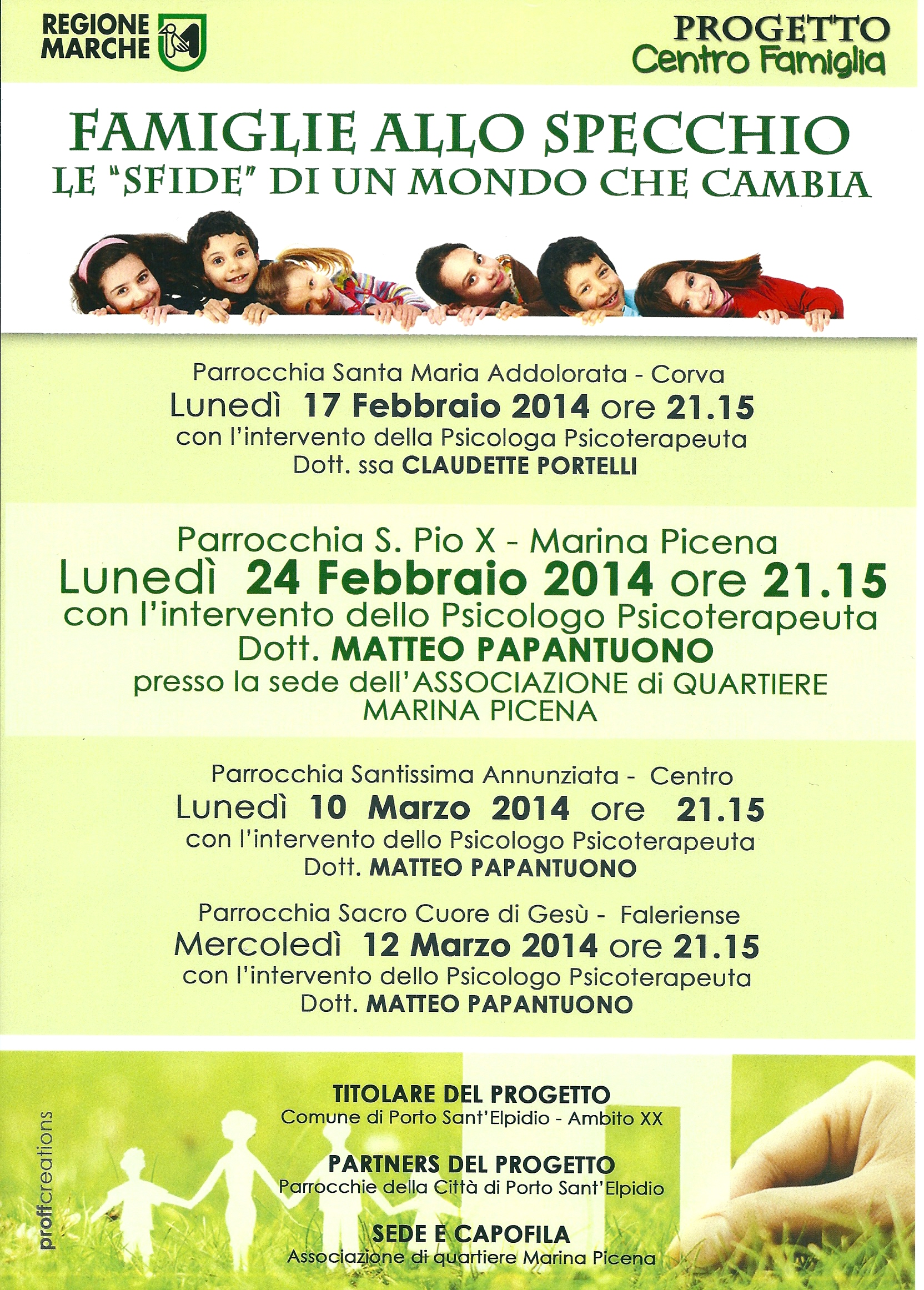 PORTO SANT’ELPIDIO – Secondo appuntamento per il “Progetto Centro Famiglia” lunedì 24 febbraio, ore 21.15, presso la sede dell’associazione di quartiere Marina Picena in Via Liguria Snc (locali adiacenti alla scuola dell’infanzia Peter Pan).