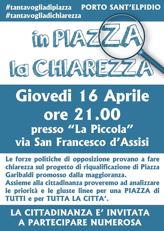 PORTO SANT’ELPIDIO – Domani sera, alle ore 21:00 presso “La Piccola”, si terrà un incontro organizzato congiuntamente dalle forze di opposizione per fare chiarezza riguardo alla riqualificazione di Piazza Garibaldi.
